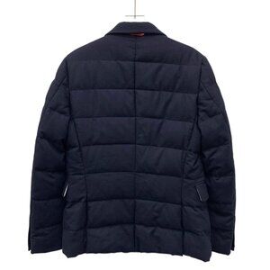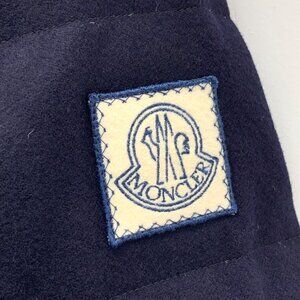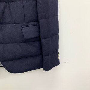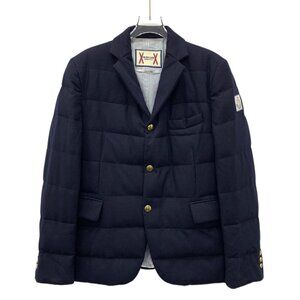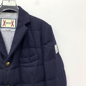Deep navy wool down jacket in a blazer-style cut, featuring signature TB embroidery and Moncler logo detailing — merging refined tailoring with functional warmth.