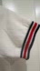Elegant Moncler polo in ivory with red and navy striped collar and sleeves. Iconic logo on chest.