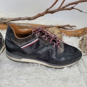 leather camouflage print sneakers in black and gray colorway. missing a couple of rivets where the laces go into shoes. a little mark on front which doesn't affect wear. all flaws are pictured so please look thoroughly before purchase.