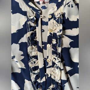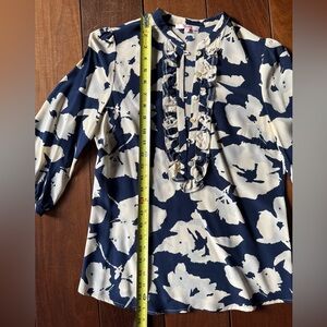 Vintage French brand Moncollet, bought at Anthropologie, blue ruffle 100% silk blouson. Navy and bone/white patterned shirt with front slip in buttons and ruffle. Three quarter length sleeves with single button detail. Size 0. Loose silk style. Measurements in pics. EUC. Pretty, soft French look for workwear. Good length to tuck in or leave untucked. No flaws.