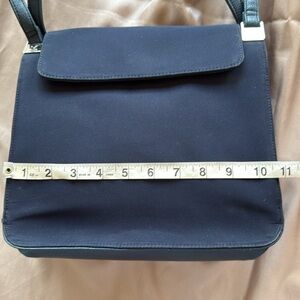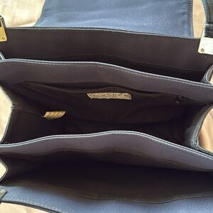 Mondani Navy Blue Leather & Peau de Soie Fabric Structured Shoulder Bag 3 Sections with a zip inner pocket. Silver Accents. Interior super clean. Flap and magnetic snap closure. Leather straps sides and base. Approximate measurements in photos. Gently used in great condition.