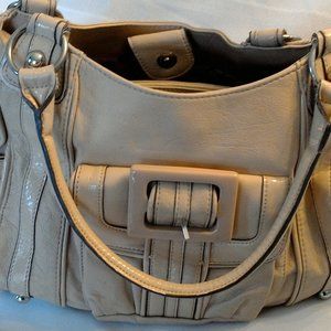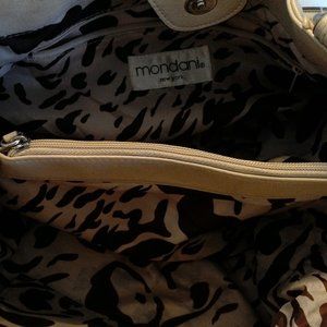 Mondani New York beige shoulder purse. 2 handles; front magnetic snap pocket; 2 side pockets; 3 large pockets (1 zips shut, 1 has a smaller zippered pocket inside and the other has 2 open pockets inside). There is a snap closure across the large pockets. Approximate measurements: 17" wide, 10" tall, laid flat; 5" bottom. Like new condition.