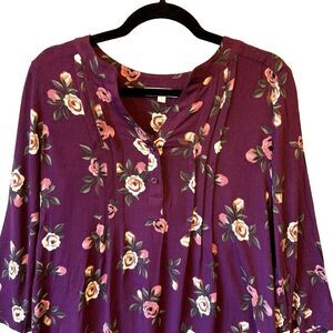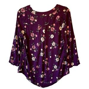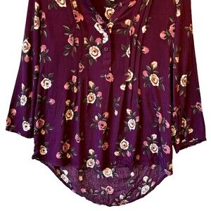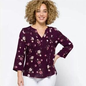 Monday Fun Henley Blouse Small Dark Maroon Floral Blouse Pleated V-Neck NWOT
