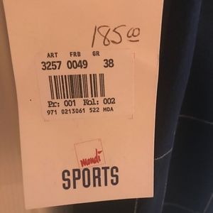 This is a navy sport walking shorts with white lines. 20" in length. Size is marked 38 which is US 10. It is a rayon, polyester and spandex blend fabric. Unlined. Dry clean.