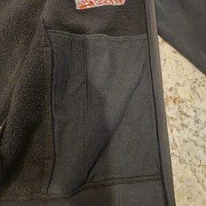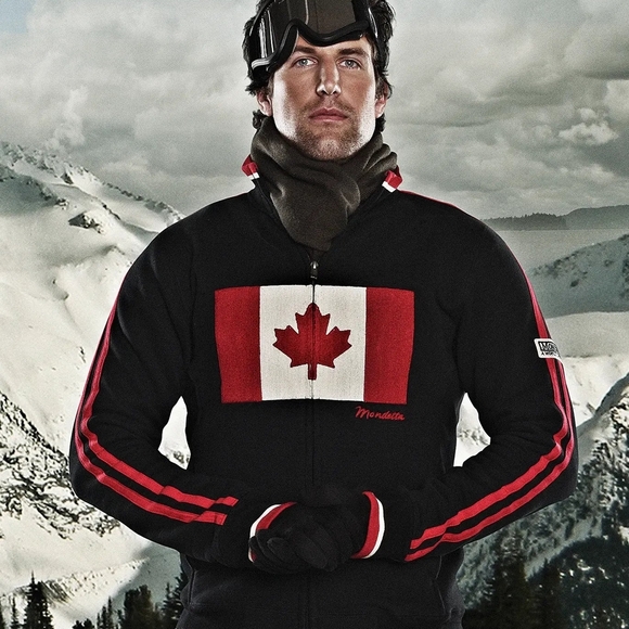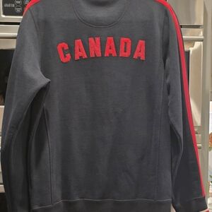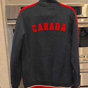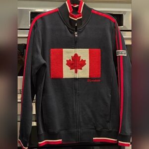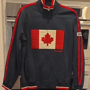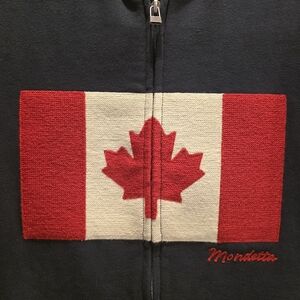 This is a Mondetta Pitch Field Jacket with Canadian Flag embroidered on front and CANADA in felt letters on back. Jacket has MONDETTA A WORLD UNDIVIDED patch on right arm. Jacket is full zip front with pockets and inside pockets. Jacket is cotton/poly like a sweatshirt material.