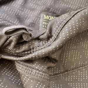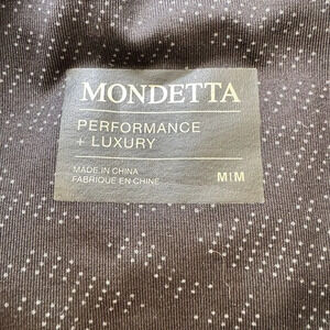 These are Mondetta ankle leggings in size Medium, perfect for travel, activewear, or casual wear. They are a dark blue color with a slimming fit and feature an elastic waist for comfort. Made of a blended fabric of polyester and spandex, these leggings have a zipped back pocket. Ideal for gym & training, walking, or yoga, they are machine washable and suitable for all seasons.