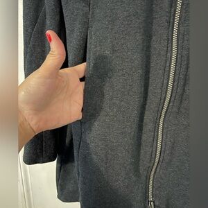 Sleek charcoal utility jacket with hood. Features full zip closure. Ideal for layering.