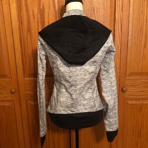 Thumb holes and detachable hood. Size women’s small. Fit is made to hug your curves - very flattering!
