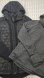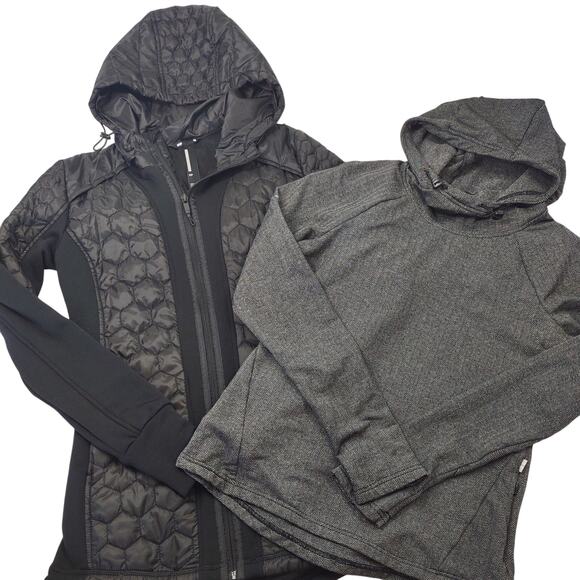 Jacket and pullover in good condition, black and gray in color; both have thumb holes and hoods, jacket is a small and pullover with herring bone pattern is a medium.