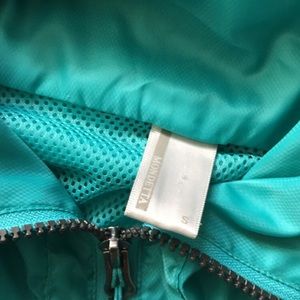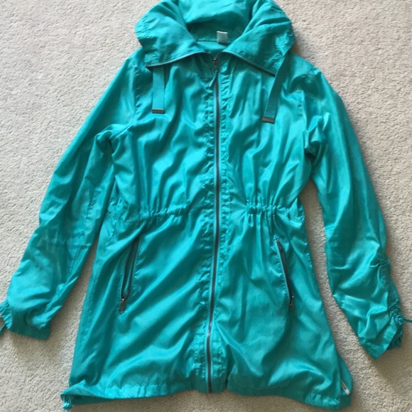 Teal blue Mondetta liner. Waist, hood & bottom seam all are adjustable for a snug or loose fit. Very easy to wear with a sweatshirt under!