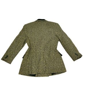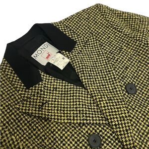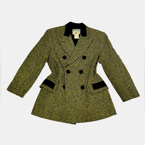1980s black and yellow houndstooth tweed double breasted jacket with black collar and cuffs, and pockets. Made from 87% wool and 13% nylon.