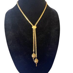 This Monet Vintage Gold Chain Slide Dangle necklace is a statement of true sophistication and grace. Featuring two sparkling drop down balls and lavish gold tone. Every detail of this masterpiece is carefully constructed for a timeless and luxurious feel and appearance.