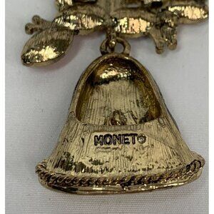 Monet 1990's Holiday Bell Bejeweled Christmas Brooch Pin Golf Tone Red Green 2"