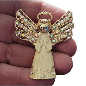 Add a touch of vintage elegance to your collection with this beautiful Monet angel pin brooch. This gold-tone brooch features a lovely enamel design, accented with shimmering AB crystals that catch the light with every movement. Perfect for adding a touch of celestial charm to any outfit or as a cherished gift for someone special.