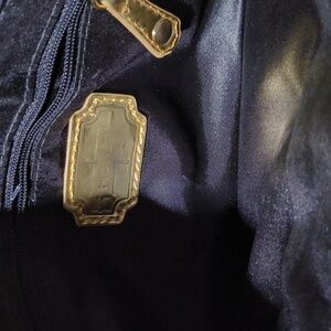 Sleek black clutch with a bold gold chain. Features a stylish emblem on the front. Perfect for evening outings. This clutch is in pristine condition.