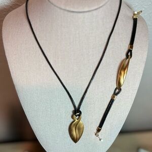 Monet Black Leather with Gold-tone Leaf Pendant Necklace, Bracelet & Earrings Set