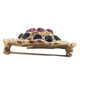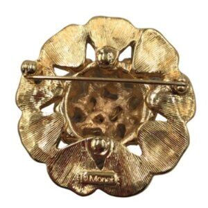 This is a gorgeous Monet brooch featuring a gold-tone round petal wreath surrounding a mound of ruby red rhinestones. It has has a rollover clasp that is nice and tight to hold the pin firmly in place.