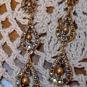 Beautiful Monet champagne brown pearl dangle stud earrings are about two inches long. They also have chocolate faux diamond rhinestones.