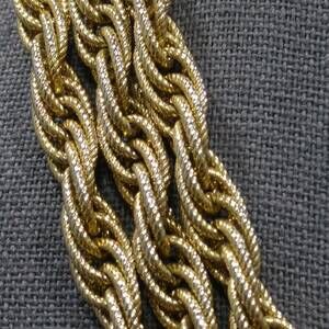 This is a gorgeous vintage Monet extra-long chain necklace from the 1960s–1970s. The design features textured oval gold plated links with a substantial weight and shimmer. Measuring an impressive 56 inches in length, this versatile piece can be worn long, doubled, or layered into multiple strands for different looks.