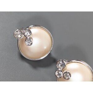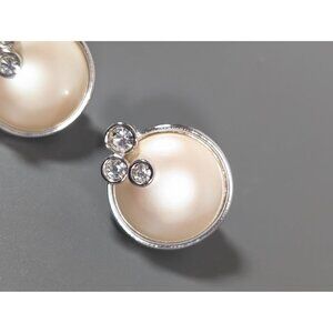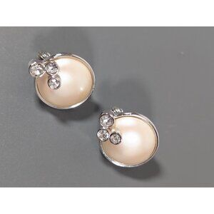 Monet Faux Pearl Cabochon Rhinestone Round Silver Tone Clip On Earrings