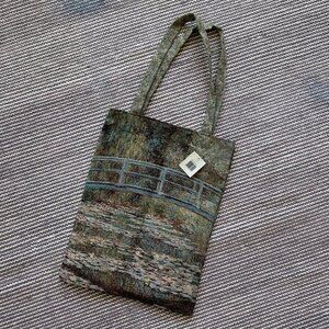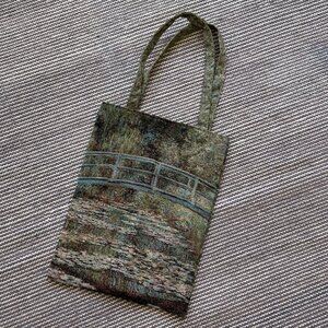 Tapestry woven tote bag from Rolande Du Dreuilh, France, depicting Monet's famous painting of the bridge over water lilies at Giverny.