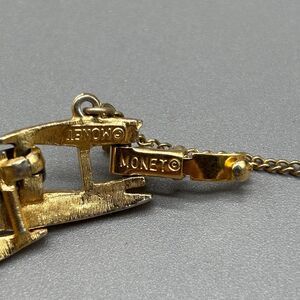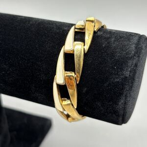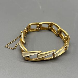 Vintage Monet gold-tone bracelet featuring angular geometric links with cream enamel insets. Classic mid-century modernist style with a secure fold-over clasp and attached safety chain. Measures approximately 7" long by 1" wide. Pre-owned, very good condition with mild surface wear consistent with age. See photos for measurements and condition details.