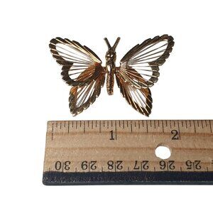 A vintage Monet Gold Tone Filigree Butterfly Brooch Pin, perfect for nature fashion lovers. This exquisite piece features intricate metalwork, resembling the delicate beauty of a butterfly.
