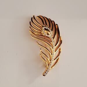 Monet Gold Tone Leaf Brooch Pin with Clear Rhinestones Excellent Signed