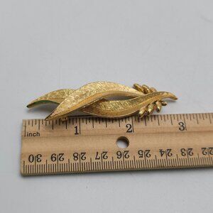 Monet Gold Tone Textured Leaf Brooch Pin Mid Century