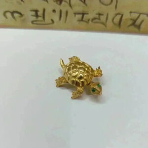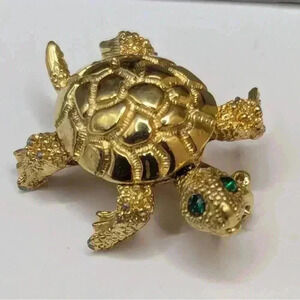 Elegant gold turtle brooch with movable articulated head. Features green gem eyes. Perfect for adding charm to any outfit.