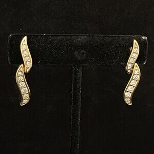 Monet Gold & White Rhinestone Feather Leaf Dangle Post Earrings Hinged leaf feather design. Yellow Gold metal color with white/clear round stones in pot metal setting. Both earrings and post-earring backs are signed/stamped with Monet. Earrings measure 1.25" long top to bottom.
