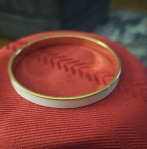 This simple yet elegant vintage Monet bangle bracelet features a sleek gold tone and white enamel design. Dress it up or down. Perfect for stacking.