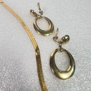 Elegant gold-tone jewelry set includes a herringbone necklace and oval clip-on earrings, offering classic style and timeless beauty.