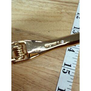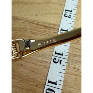 This Monet gold-tone bracelet features a hinged design with rhinestone accents, offering both elegance and practicality for accessorizing a polished look.