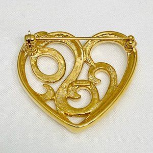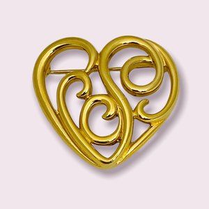 Monet goldtone scroll heart brooch. Excellent pre-owned condition. Finish is in great condition. Pin back runs horizonally at the top of the heart. Pin stem is approximately 1.25". Pin stem and catch both work great. All photos are of the same brooch on different backgrounds Signed Monet.