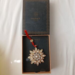 The Monet Jewel & Pearl Snowflake Christmas Ornament is a 2019 gold and silver ornament with a snowflake shape, perfect for the holiday season. Made with glitter, metal, and rhinestones, this Christmas ornament from the Monet franchise features a festive design that adds a touch of elegance to any Christmas tree. Packaged in its original box, this ornament is a stylish addition to any Christmas ornament collection.