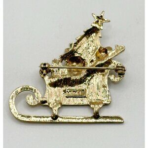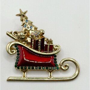 The Monet Gold Tone Santa's Sleigh Brooch Pin is a festive and charming accessory perfect for the holiday season. With a sleigh shape design and gold tone finish, this brooch pin adds a touch of elegance to any outfit. The Santa's Sleigh theme gives it a seasonal feel, making it a great addition to your Christmas jewelry collection. Perfect for both adults and children, this brooch pin is a fun and stylish way to show off your love for the holidays. Measures 1.75”.