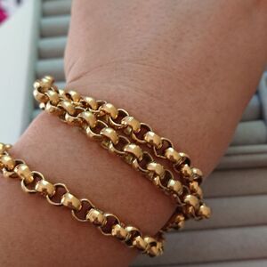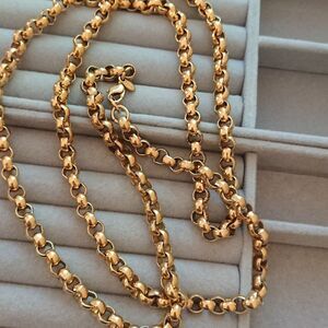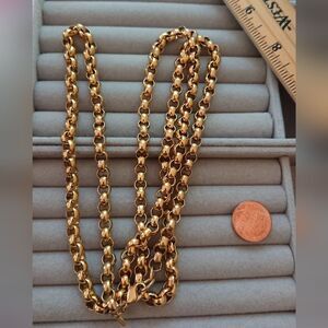 Smooth and simple, this long rolo chain necklace is made of flash plated antiqued gold over brass, ending in a traditional clasp.