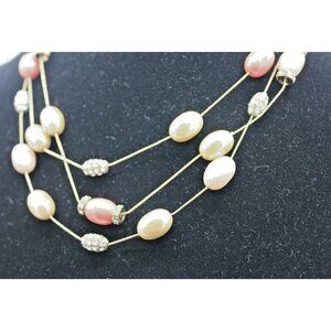 Monet Necklace Triple Strand Pink Signed Goldtone Clear Rhinestones Adjustable