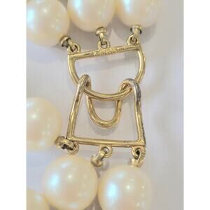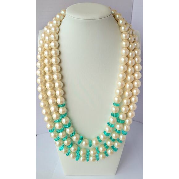 A fabulous vintage Monet necklace in excellent condition. The 3 strands drape beautifully and the turquoise/aquamarine beads shimmer. The faux pearls are not bright white but a classic pearlescent white. The clasp is unique and is signed MONET, and has some slight wear. See photos for details and size.