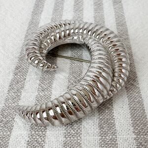 Monet Rams Horn Brooch | Vintage Silver Tone Modernist Ribbed C-Shaped Pin Signed