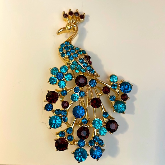 Goldtone peacock bedazzled with pretty teal blue and maroon rhinestones