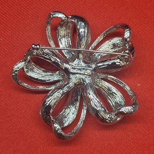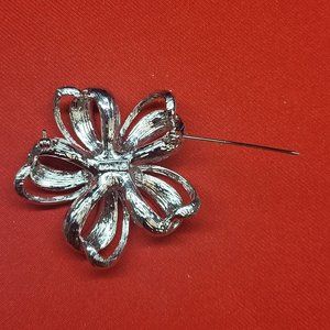 Monet Silver Tone Clear Rhinestone Bow Flower Brooch Looped Ribbon Pin