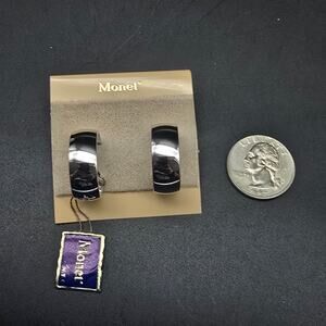 These vintage Monet clip on earrings feature silver tone hoops and measure .4" W x .8" D