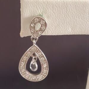 Monet silver tone earrings are covered in pave crystals and have a clear crystal dangling in the center of a tear drop. Very good condition.
