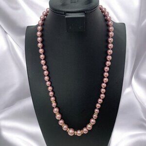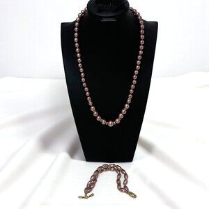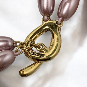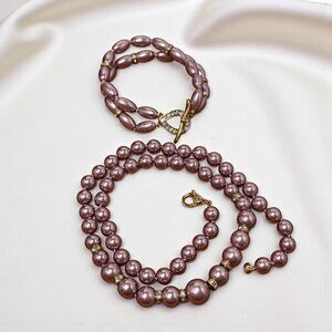 An absolutely beautiful, hand knotted, simulated pearl necklace and bracelet set by Monet featuring a single strand necklace of dusky rose faux pearls and a matching double strand bracelet with gold and crystal spacers. Each piece has a crystal studded gold-tone clasp, signed with the Monet logo. Excellent preowned condition.