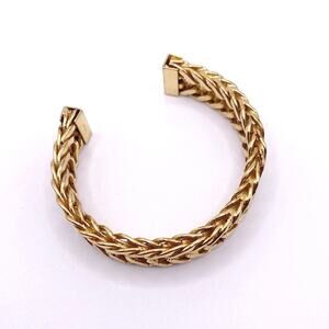 This vintage Monet braided bracelet from the 1980s features a sophisticated woven design in gold-plated metal. Measuring approximately 7 inches, the bracelet is lightweight yet bold, making it a versatile accessory for both casual and formal outfits.