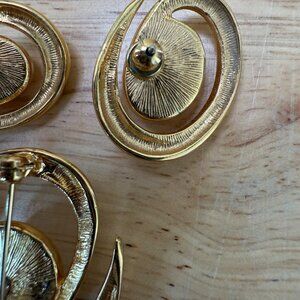 This Monet demi-parure set includes a brooch and pierced earrings, featuring a gold-tone swirl design with faux pearl centers for a sophisticated look.