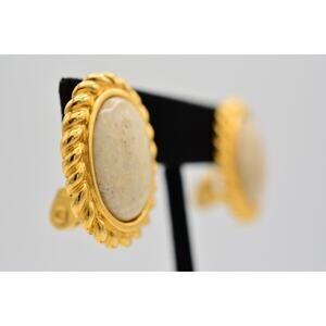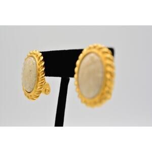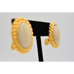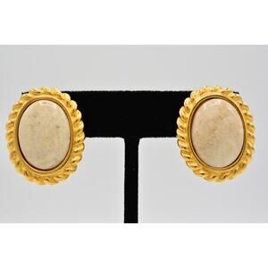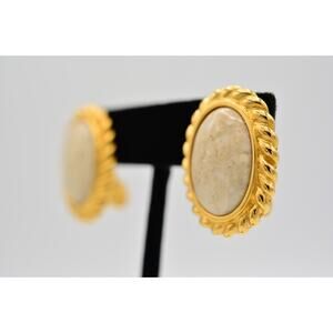 Monet Vintage Cabochon Clip Earrings Marble Stone Gold Tone Chunky Signed BinAG
