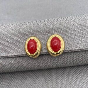 Vintage Dome Gold Tone Red Gemstone Cabochon Earrings